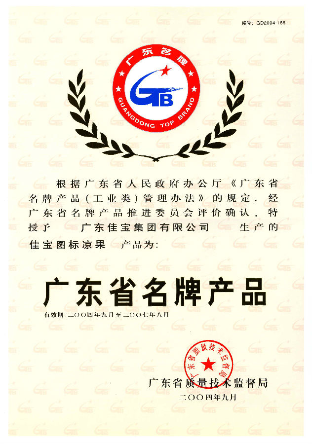 2004年 佳寶涼果 廣東省質量技術監督管理局