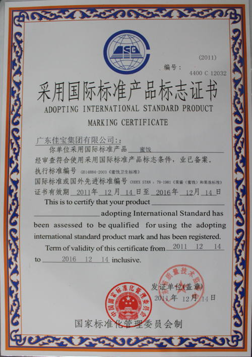 2011年12月,佳寶蜜餞產(chǎn)品經(jīng)國家標(biāo)準(zhǔn)化管理委員會、廣東省質(zhì)量技術(shù)監(jiān)督局審查,符合采用國際標(biāo)準(zhǔn)產(chǎn) 品標(biāo)準(zhǔn)產(chǎn)品標(biāo)志要求,并獲得采標(biāo)證書(ISC)。 2015-03-06