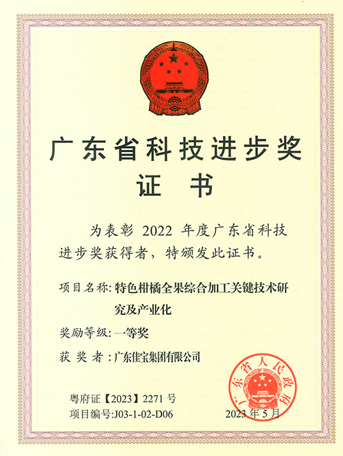 在日前廣東省人民政府官方網站發布了2022年度廣東省科學技術獎獲獎名單,佳寶集團憑借“特色柑橘全果綜合加工關鍵技術研究及產業化”項目獲省科技進步獎一等獎。該項目研究創新了傳統陳皮、蜜餞現代化加工技術與裝備,推動了傳統產業轉型的升級,實現了柑橘全果綜合利用等,為促進柑橘加工產業健康發展發揮了重要作用!
